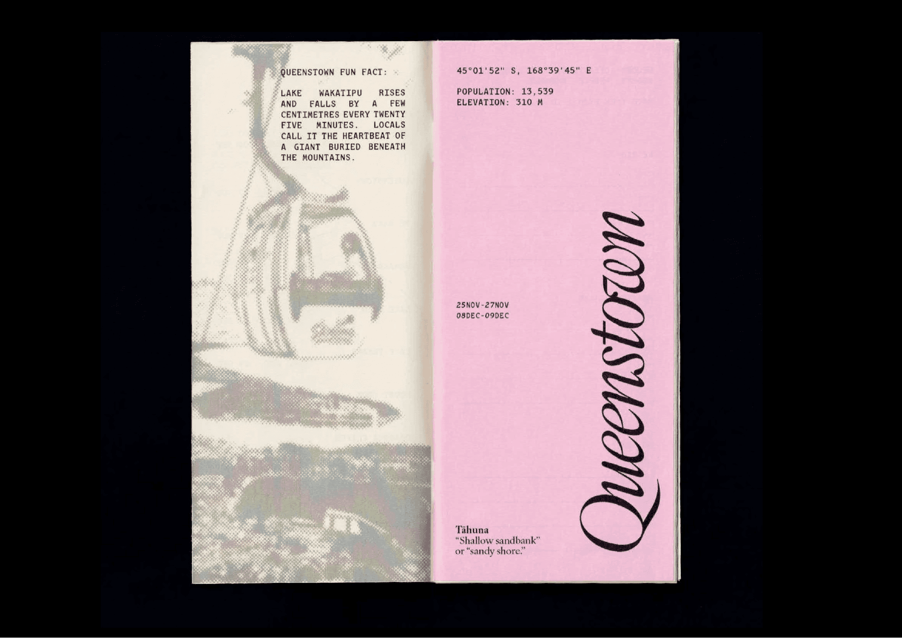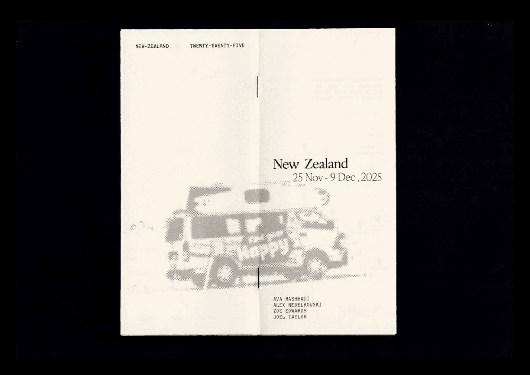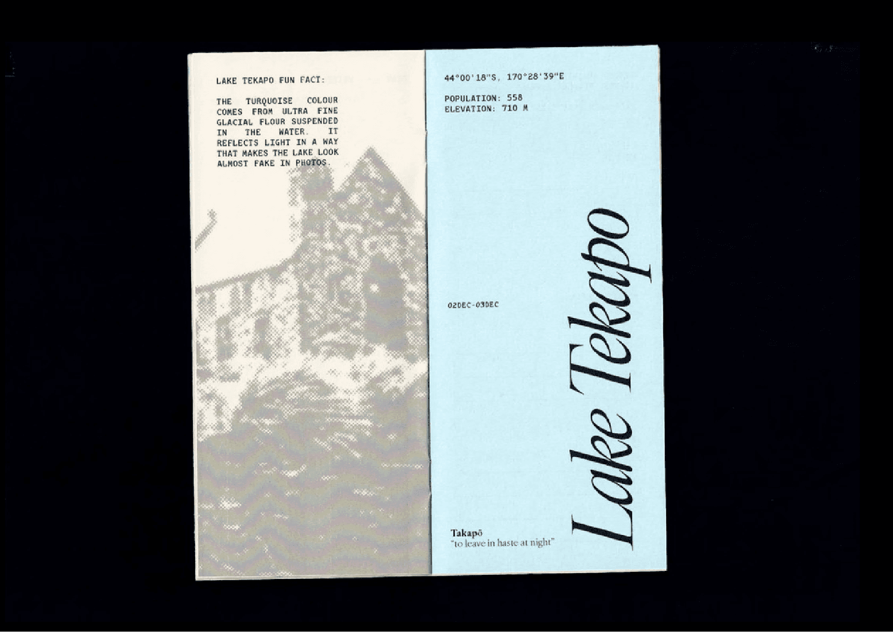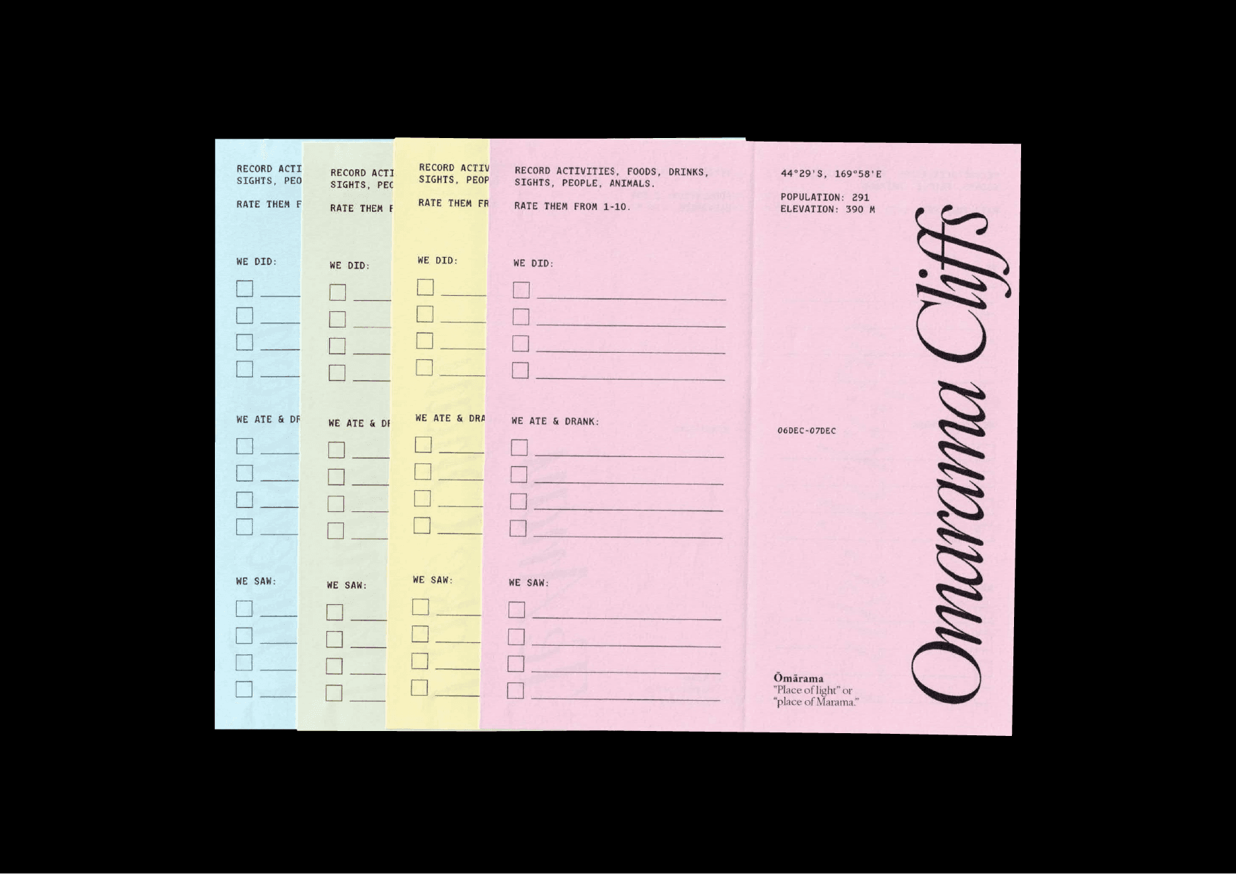 This publication was a personal project completed in anticipation of a two week caravan adventure up and down the south island of New Zealand (Aotearoa). My goals going into this project were to produce something that communicates a sense of joy, looks aesthetically pleasing as a memento, is convenient to interact with, and encourages the user to slow down and be mindful of the memories they are making.