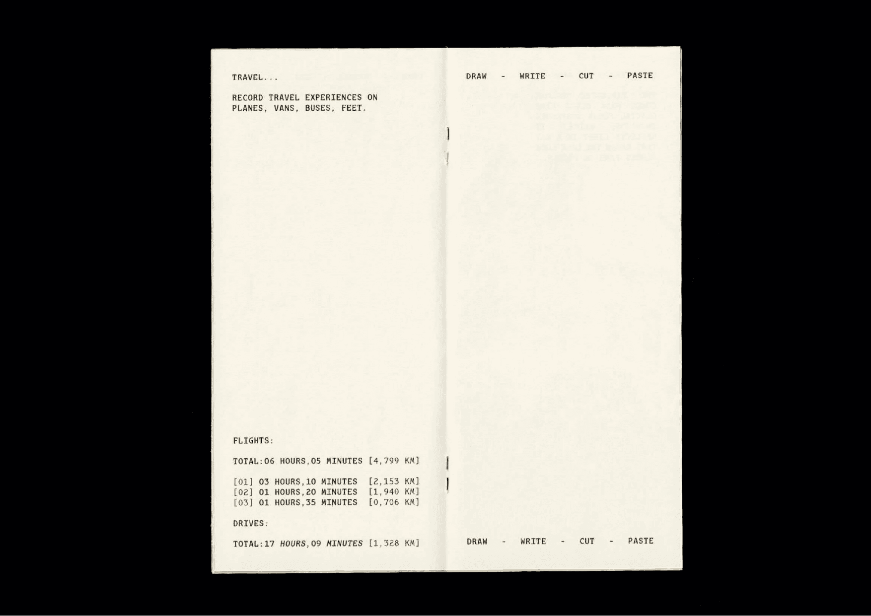Scale was an immediate consideration - I wanted the booklet to fit comfortably in the hand, while being large enough to leave space for the user's contribution. To solve this, I referenced the dimensions of an airline boarding pass, an apt piece of inspiration. It was initially my plan to incorporate an outer cover with a sleeve piercing through the spine into the centre spread, which would hold the user's boarding pass and subsequently bind the booklet. For the sake of durability and production timeframe this idea had to be abandoned.