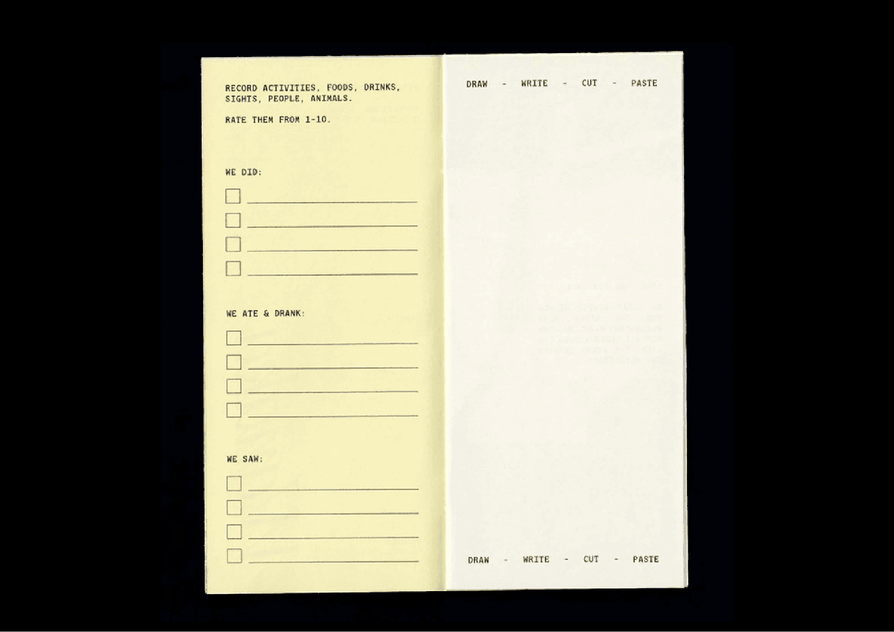 Pastel and natural paper stocks were selected, which played a substantial role in communicating a sense of calm, authenticity, and joy. As always, materiality was a big factor in this project, but what I found interesting abut this instance was the negotiation required between material and layout. Given the saddle stitch binding of this booklet, I was able to alternate pages between natural and pastels through careful consideration. This gave me extra natural coloured spreads at the beginning and in the middle, which then informed the inclusion of the itinerary, travel journal, and free range spreads.