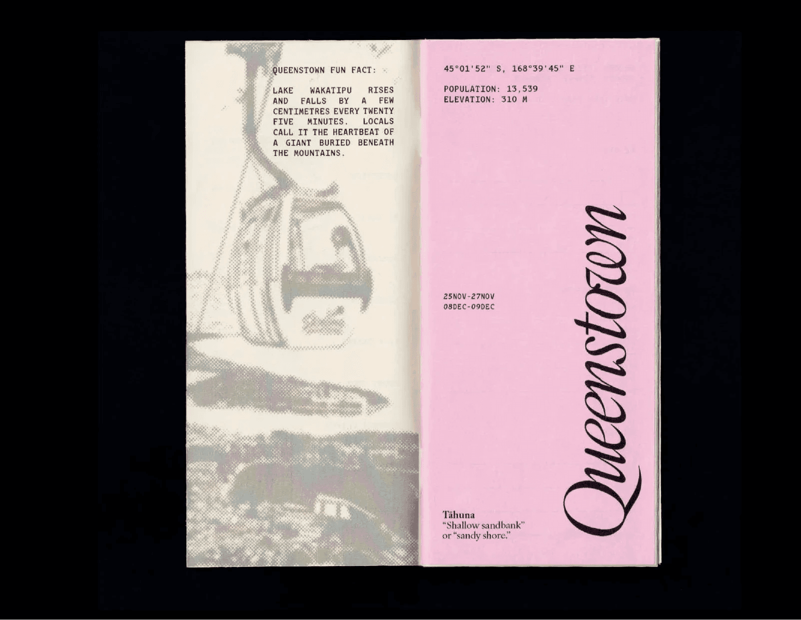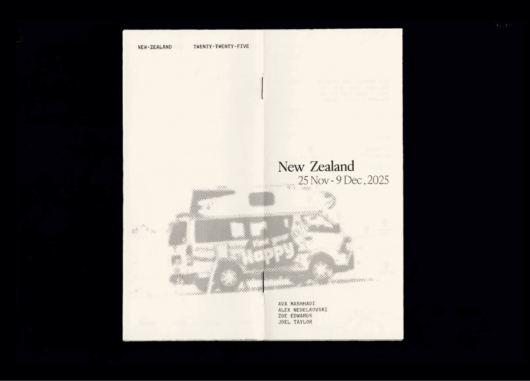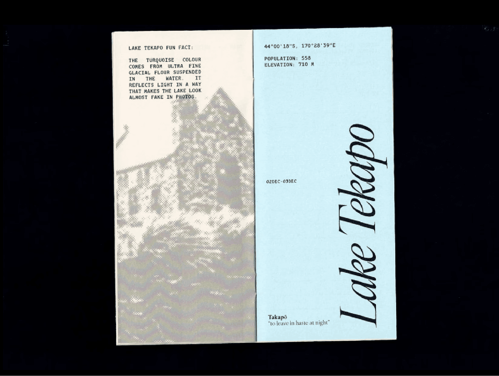 This publication was a personal project completed in anticipation of a two week caravan adventure up and down the south island of Aotearoa / New Zealand. My goals going into this project were to produce something that communicates joy, functions as a memento, is enjoyable to interact with, and most importantly encourages travellers to be present in their own experiences.