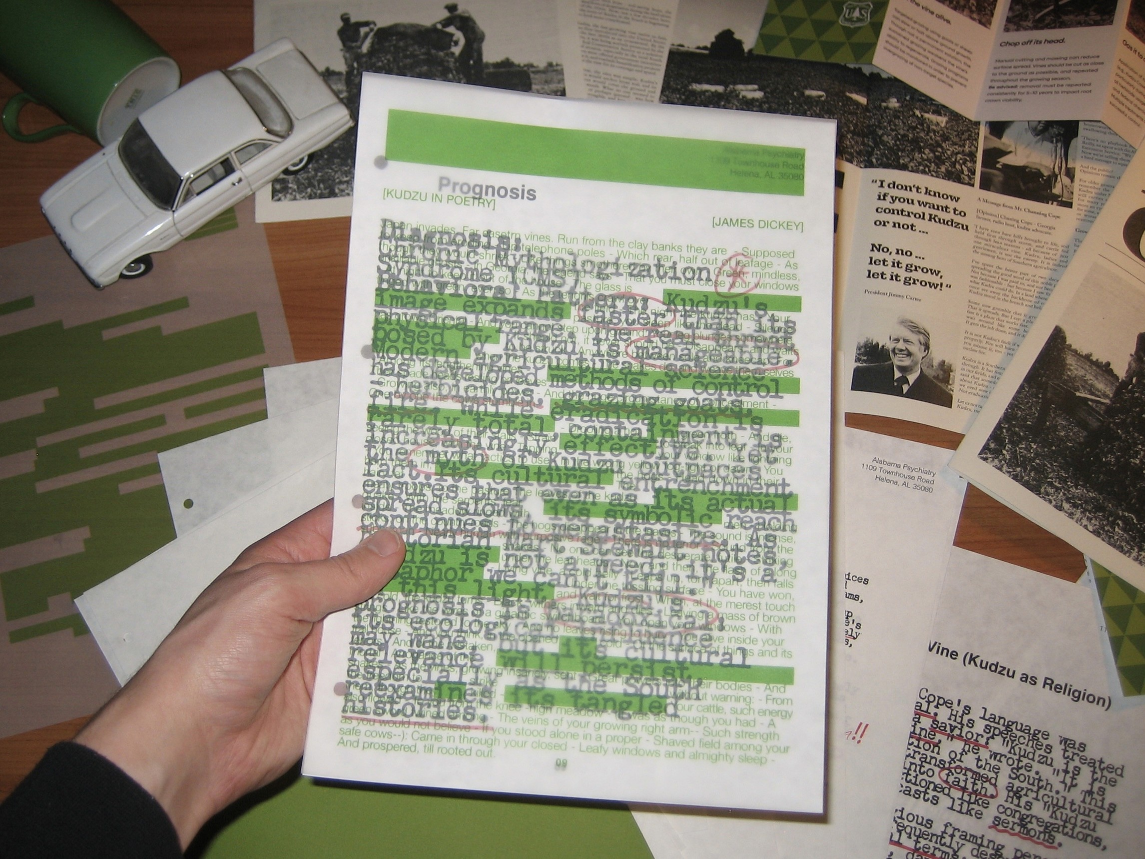 The final outcome was crafted from a wide variety of materials including parchment, vellum, card, gloss, and bulky news paper stocks. All elements were 'bound' together in a green folder, mimicking an investigative file. To emphasise the mysterious tone, the project was photographed using a digital camera in a dark office setting, acting as a promotional shoot titled 'The Night the Kudzu Has', taking reference from James Dickey's poem 'Kudzu'.